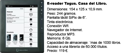 Casa del Libro acaba de lanzar al mercado un ereader que promete. Se llama Tagus, tiene unas dimensiones de 154 x 125 x 10,9 mm, pesa 244 gramos y su precio es de 119 euros en un pack de lanzamiento que incluye el diccionario de la RAE integrado y un ebook, «El imperio eres tú«, de Javier Moro, ganador del premio Planeta 2011. El artefacto tiene una capacidad de memoria de 6 Gb y permite almacenar más de 1000 títulos.