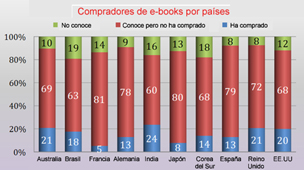 Un informe reciente de la firma Bowker “Global eBook Monitor” señala que un 13% de los internautas españoles ha pagado en el año 2011 por la compra de libros electrónicos, un 8% declara que no conoce esa opción y un 79% que la conoce pero que no la utiliza. La investigación se realizó simultáneamente en diez países y los resultados se han obtenido mediante encuestas a más de mil usuarios en cada uno de ellos. Los países más activos en este mercado son India, Australia y Brasil. España ocupa una posición intermedia según se aprecia en la tabla siguiente: